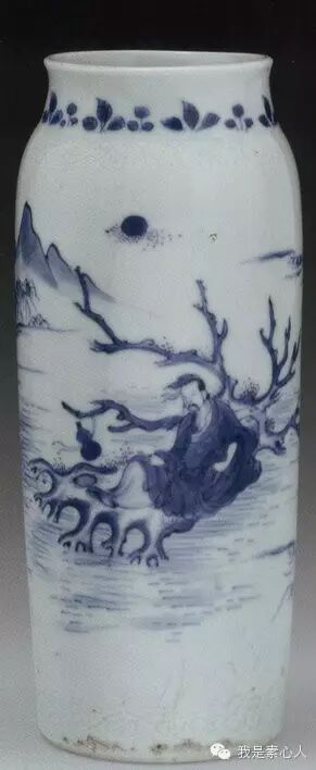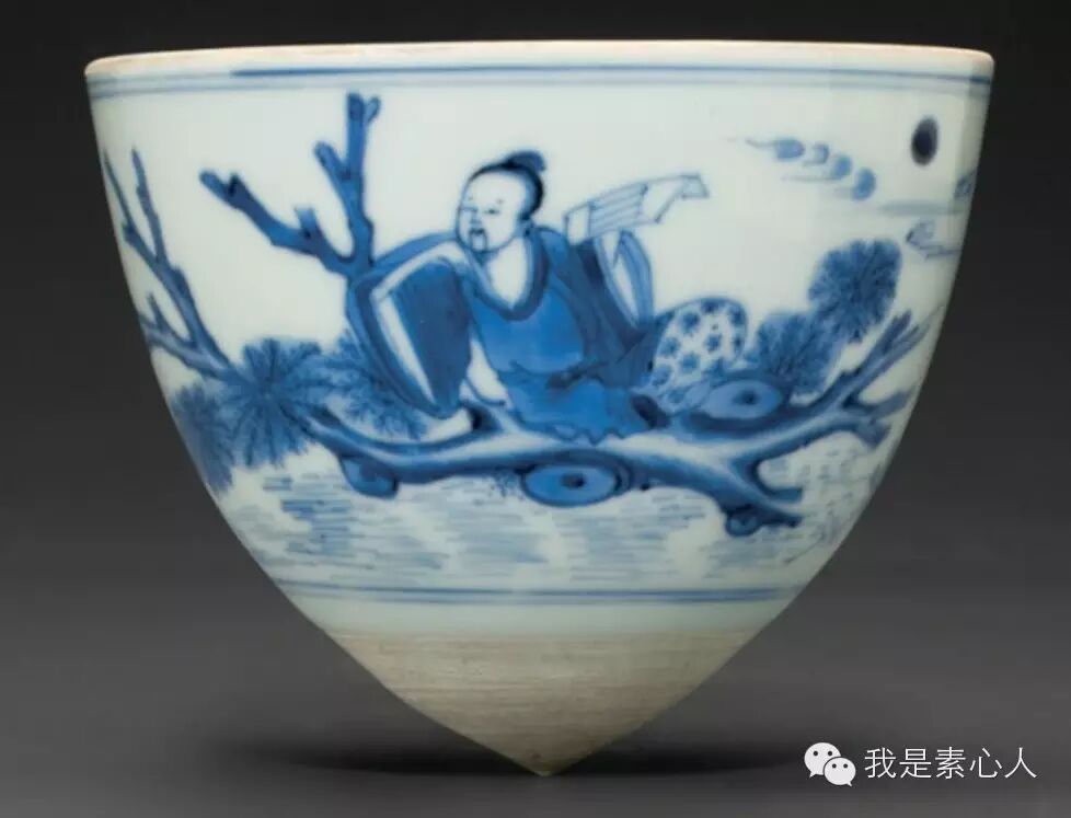 据博物馆资料显示是“李白乘槎至天河图”,估计是因为他身旁的卷卷书册,是不是李白,待考。而这一图像母本来源于张骞泛槎的传说。槎(chà)是是自然形态的树或带枝杈的树段(树杈),相传张骞为追溯黄河源头,乘木槎溯河而上,遇见一位织布的少女和牵牛少年,询问是什么地方,织女没有回答,给了他一枚织布机上用来压布的石条,让他去问占卜的隐士严君平。严君平掐指一算,告诉张骞,他遇见的是织女牛郎。后来这个故事又被记载在《博物志》中,《博物志》》是一部西晋(公元266-公元316年)的志怪小说集。记载异境奇物、古代琐闻杂事及神仙方术等。其中记载着“八月浮槎”的神话,曰:天河与海相通,有居海滨者,年年八月乘浮槎去来不失期。后代人常将两个故事串联起来,于是就有了张骞乘槎去寻天河的传说,比喻追寻一种世外桃源般的仙境。明代民窑瓷器上常见仙人乘槎图。(图二、三)