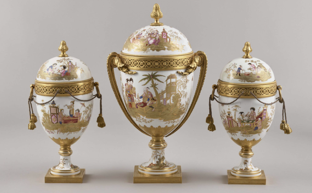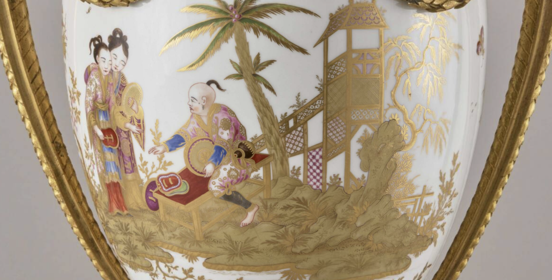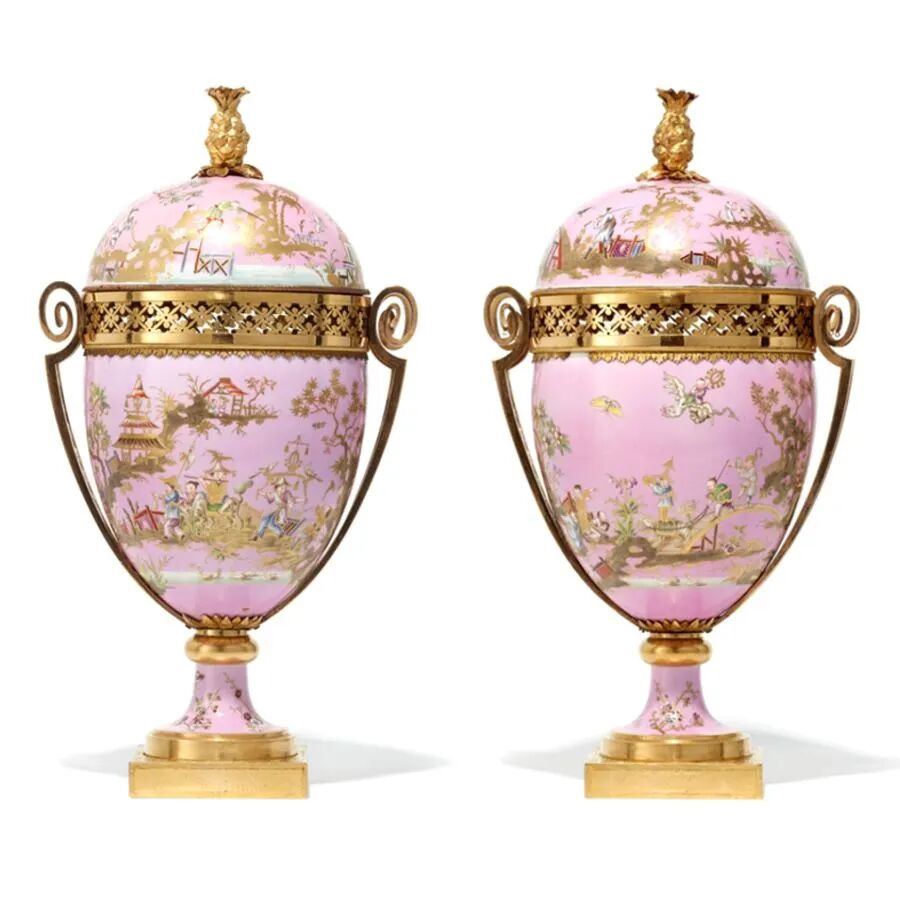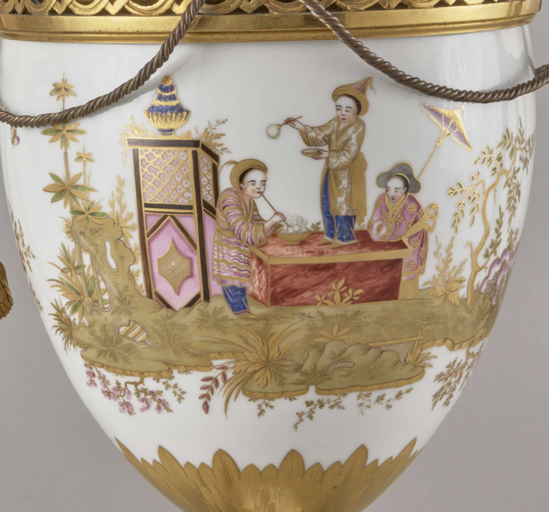 同一时期的法国,宫廷赞助的皇家塞弗尔御窑,也正在为路易十六的皇后玛丽·安托瓦内特等制作了一系列“vases œufs”蛋形花瓶,白底或者粉紫色,上面绘有游玩享乐的中国人,配上大面积金彩与镶铜鎏金的流苏,铃铛和底座,简直是‘游乐园版的中国’。
