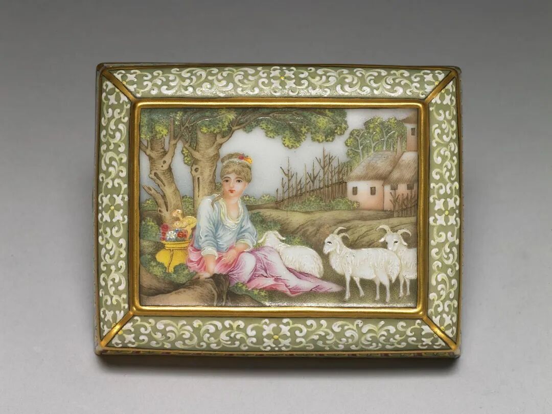 在乾隆时期,珐琅彩体系里出现了‘西洋仕女’ ‘西洋母子’ ‘牧羊女’的设计,精致的的脸庞,深邃的眼窝,明暗技法以及珐琅彩料的使用,让整幅画面看起来洋气十足。