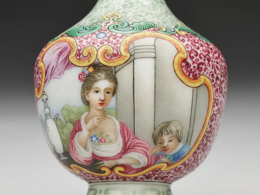 其实乾隆珐琅彩上的这些“洋美人”并不是对真实欧洲人的肖像纪录,而是被“净化”的温柔女性,是母亲、是优雅仕女和安静的小孩,是因为乾隆皇帝讲述心目中的“天下太平”,符合他的盛世太平的叙事需求。所以‘西洋美人’被安排在静谧花园,安静贤淑。