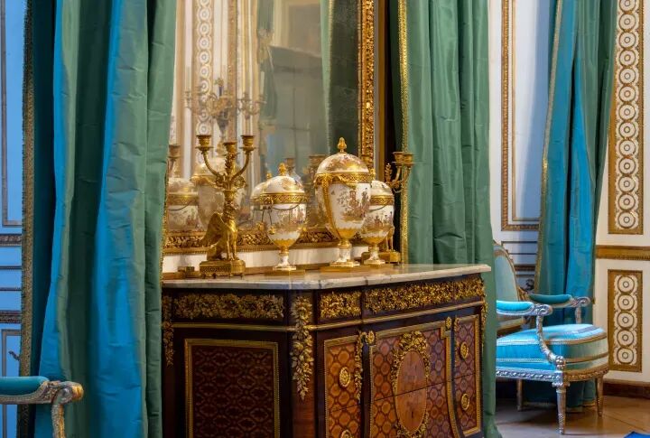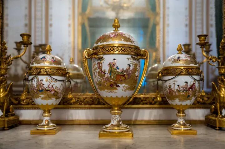 在凡尔赛,一组三件塞弗尔“蛋形中式花瓶”,要用当时最难烧成的粉紫或蓝色底釉,再请画师一格格画满“理想中国人”的日常,然后由金银铜匠为它们做出复杂的镀金铜座、流苏、铃铛和花环。最后,这样一组三件的标价是4,200里弗尔,相当于一个高薪知识分子多年的收入,可以买一栋小房产,也只有皇室才能随手一挥,买来只是随手放在壁炉一边。