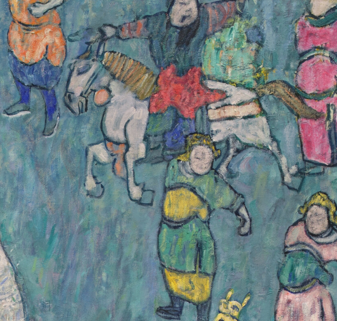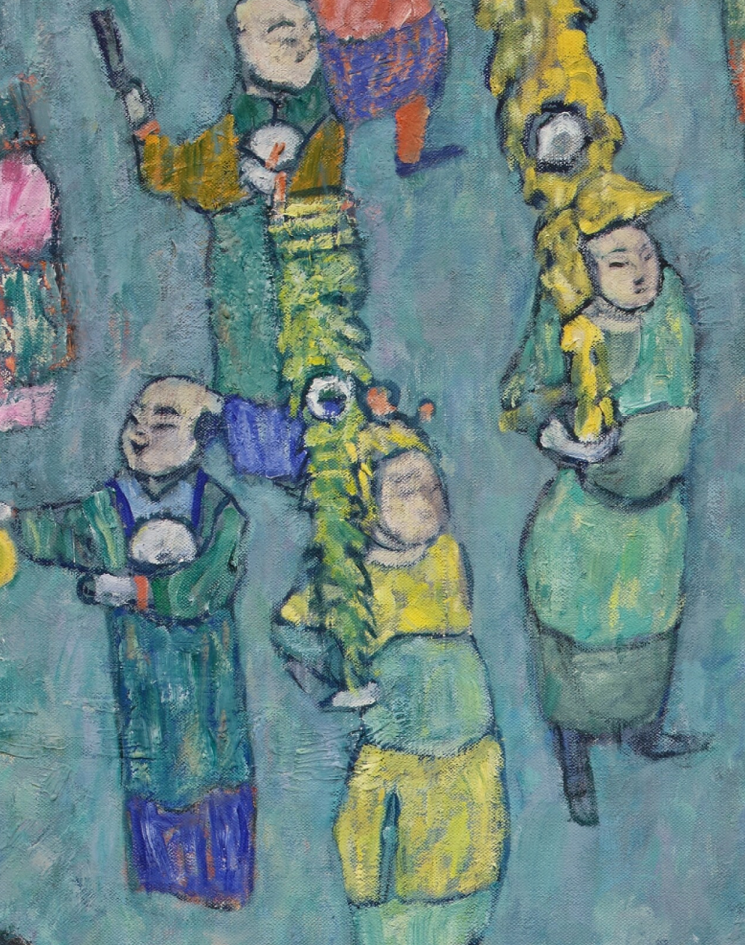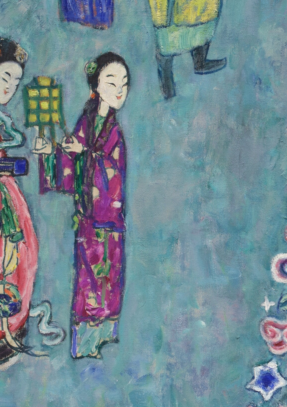 细看画面最左边的身穿紫红裙长袍仕女,衣服层层叠叠的笔触,但她的五官极度简化,这种彻底的平面化处理,与欧洲肖像传统无关,却与晚清粉彩瓷器上的仕女人物有着惊人的同构关系,她们身姿修长,脚尖轻点地面,几乎就是从晚清粉彩瓷器上复制过来。