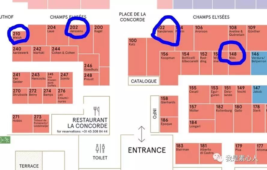 图二,2017年Tefaf展览位置图,蓝色圈出为亚洲艺术品收藏见长画廊。