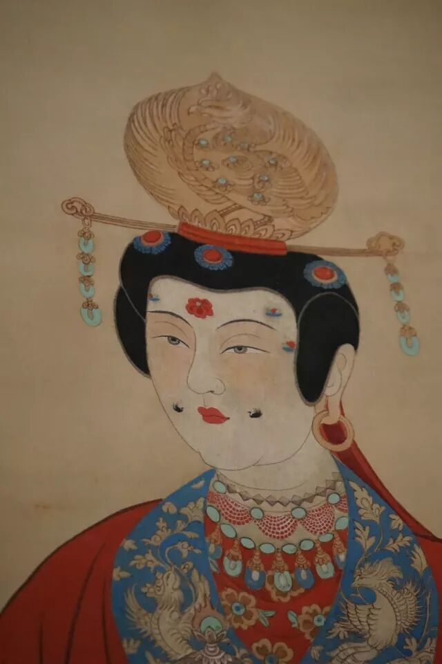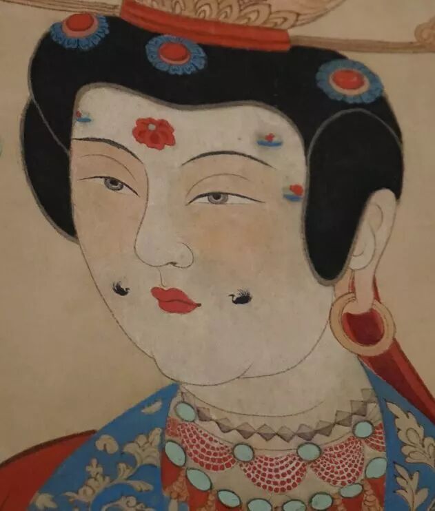 这副《李氏像轴》是张大千临摹的榆林石窟中的一幅。她的脸,代表了那个时期最流行的妆容。打底、胭脂、画眉、樱桃小嘴、眉间花钿,最可爱的是嘴边的两个小小鸭型面魇。