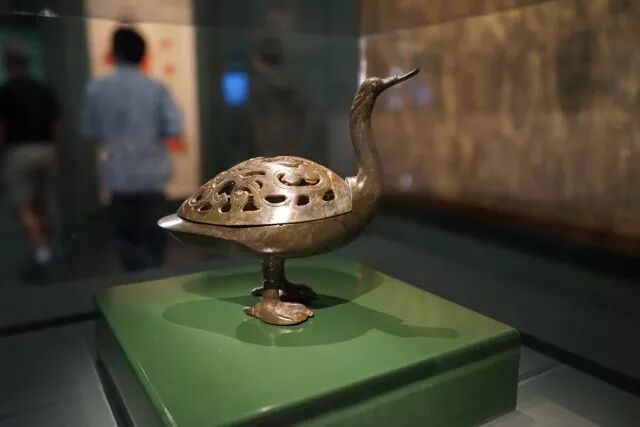 这一部分主要是展示了很多汉代时期用的各种香薰器具,各种造型熏炉。这件鸭熏炉,西汉时期,并且是赵无极2016年捐赠给博物馆的藏品。