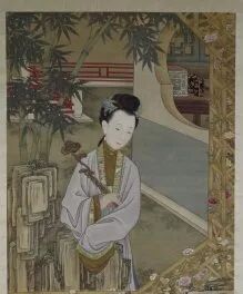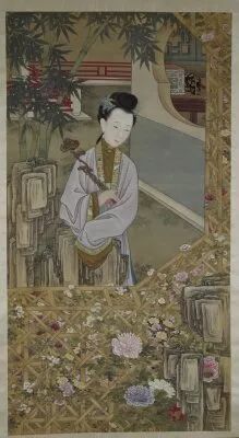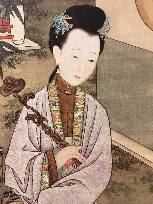 十二美人图其中《雍亲王题书堂深居图屏·立持如意》轴中,绘有仕女手持如意在庭院赏花。画面的色彩呈现低调的大地色系,仕女穿浅紫罗衫,手持竹雕灵芝如意,周围环绕着各色牡丹,暗喻着 ‘富贵如意’。