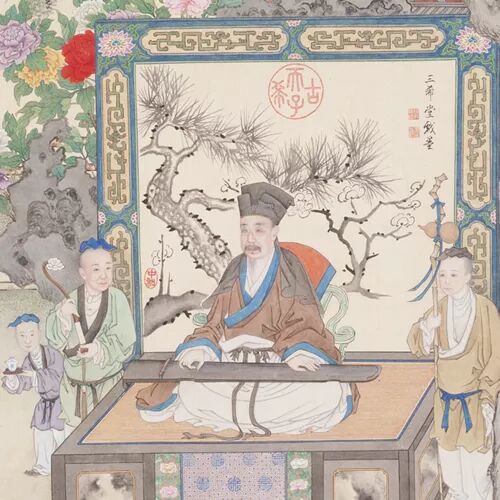 画中穿汉装的乾隆帝端坐榻上,膝上横琴,双手轻抚。六名小童分侍左右,或持如意,或握竹杖,或端茶盏,或捧图书,或浇花卉,或整理桌案,井然有序。
