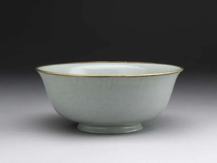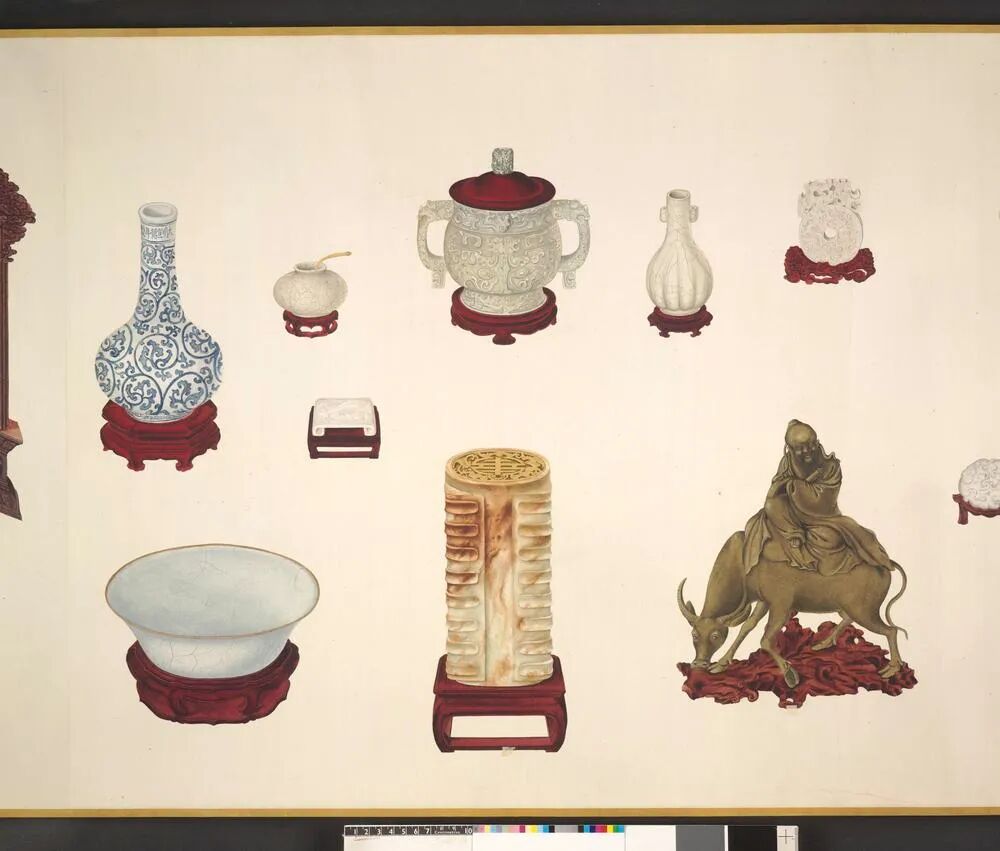 有趣的是,大维德基金会收藏的另一幅《古玩图》显示,这枚瓷碗很有可能在雍正时期就已经被收入宫中了。《古玩图》是雍正皇帝命令宫廷画师根据自己的古玩收藏绘制的手卷,在其中便有一件和这枚瓷碗极其相似的汝窑碗——我们可以从它铜制的镶边看出这一点。因此,我们有足够的理由去推测画上的汝窑碗就是我们今天在大英博物馆看到的这一枚瓷碗。两位帝王藏家与瓷碗之间的故事,也因此耐人寻味。