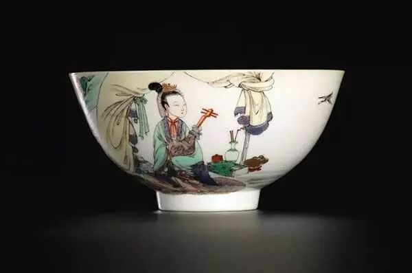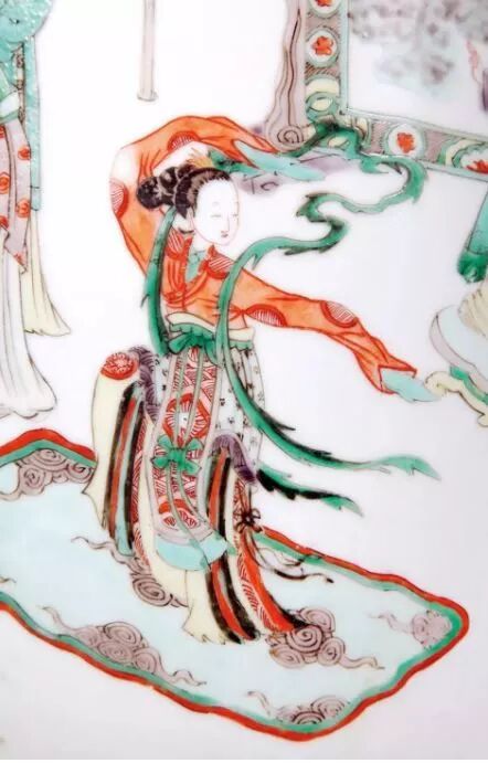 至康熙时期,经过技术改良,把调和珠明料的胶水换成了乳香油之后,釉上黑彩线条完全能达到绘画中的黑白分明如纸上勾勒一样的效果。在纯洁无瑕的洁白釉面上,黑色釉上彩的线条勾勒加强了人物的刻画,在康熙五彩仕女图装饰的瓷器上,常见黑彩勾勒眉目,使面目清晰,而美人两颊又往往晕以淡赭,更加妩媚,颇为妖娆。人物衣纹的线条有了黑彩的勾勒,衣褶更加清晰流畅,飘逸婉转的线条突出了女性的阴柔之美,曲线感十足,亭亭玉立,同时也展现了女性的高贵气质。