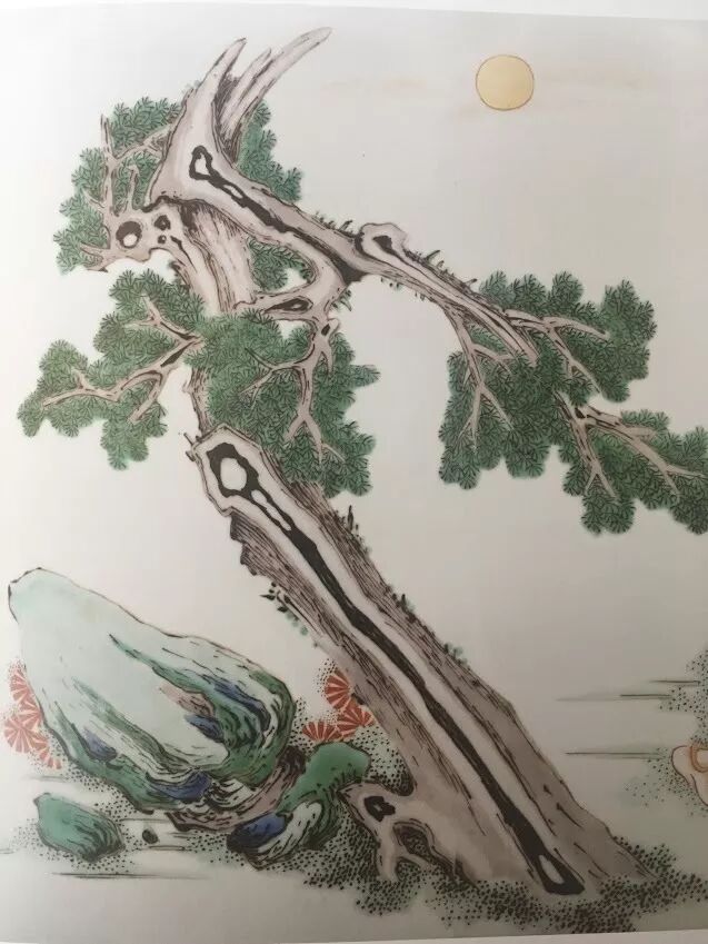除了用来勾勒人物,景德镇窑工还擅长运用坚韧均匀的线条来表述故事画面,屋舍栏杆的线条刚挺笔直,人物衣衫流畅圆转,山石树干的轮廓,又有锐利的方折线角,线条随着物体而或短或长,或粗或细,顿挫变化也很明显。大量密集的短线表现山石、树木的明暗层次,古树的蜿蜒曲折、参差不齐的树干。