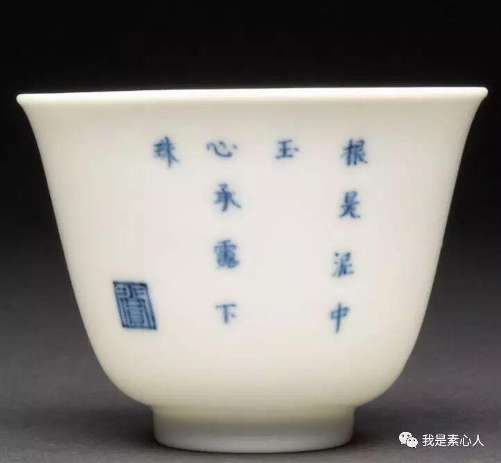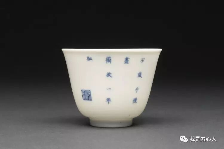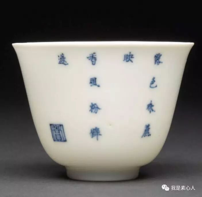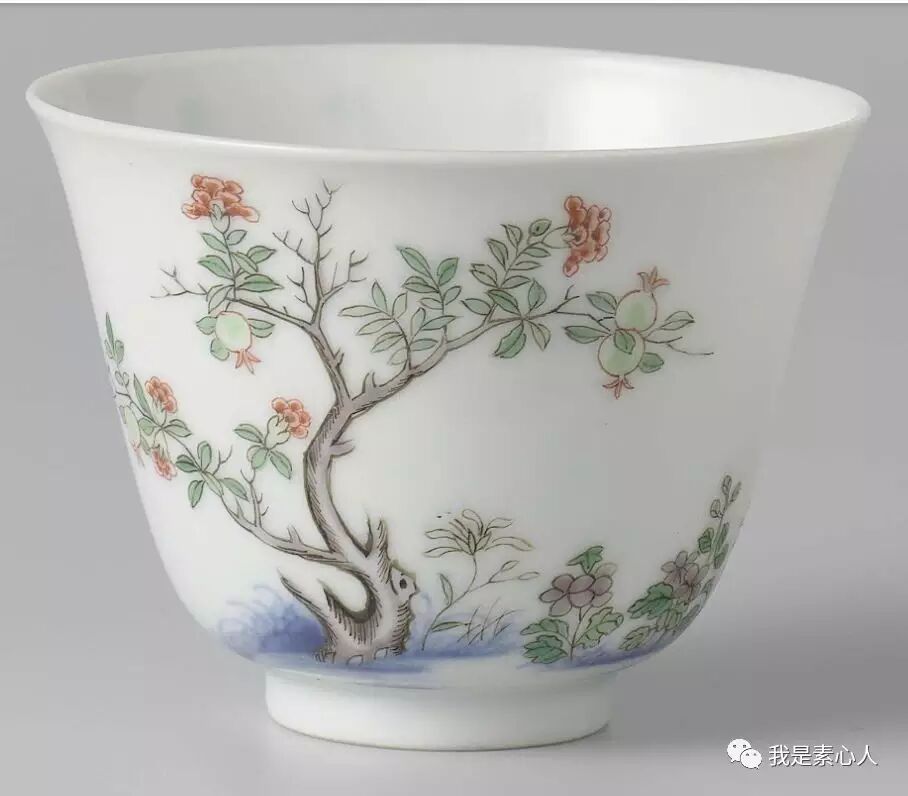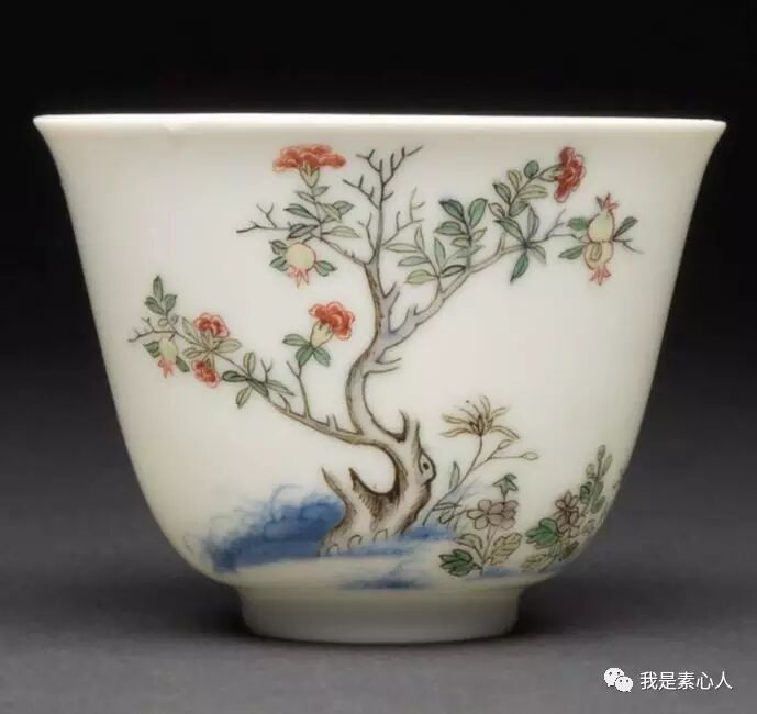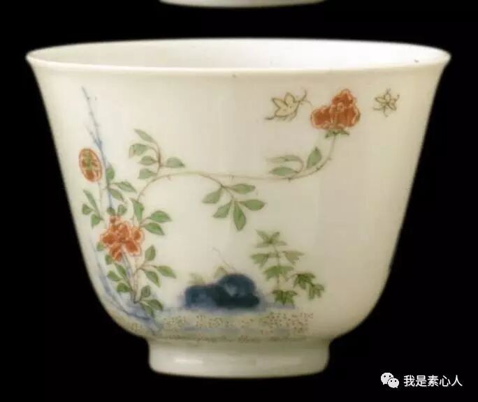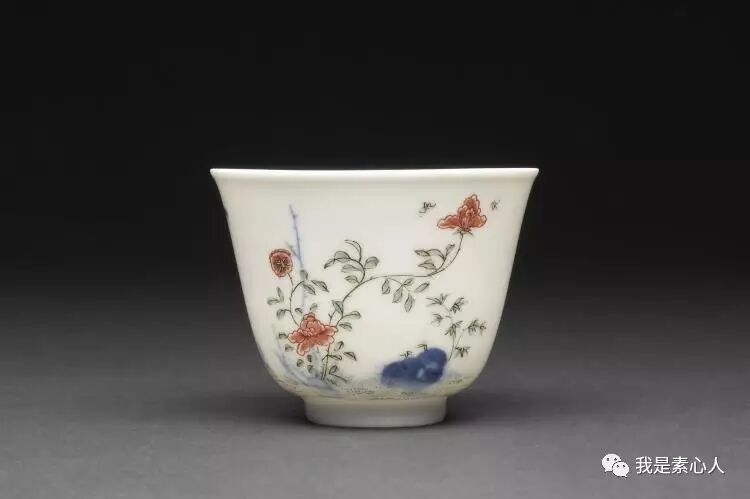 七月月季杯,画面布局流动不失平衡,右面看的正旺的花朵上停留着两只蜜蜂/蝴蝶类的小生物(康熙时期瓷器上的小动物总是很写意,呆萌呆萌的),造型柔韧,左边为主要花枝,平衡了右边的画面布局,让人赏心悦目。