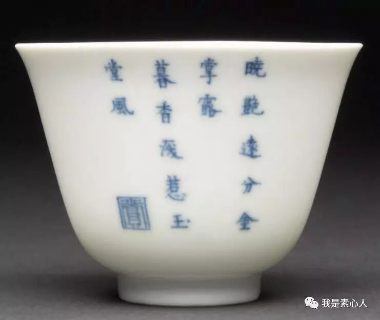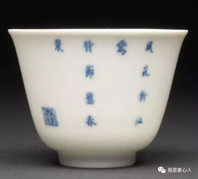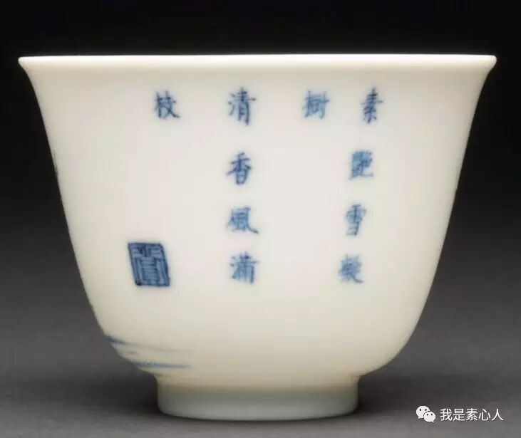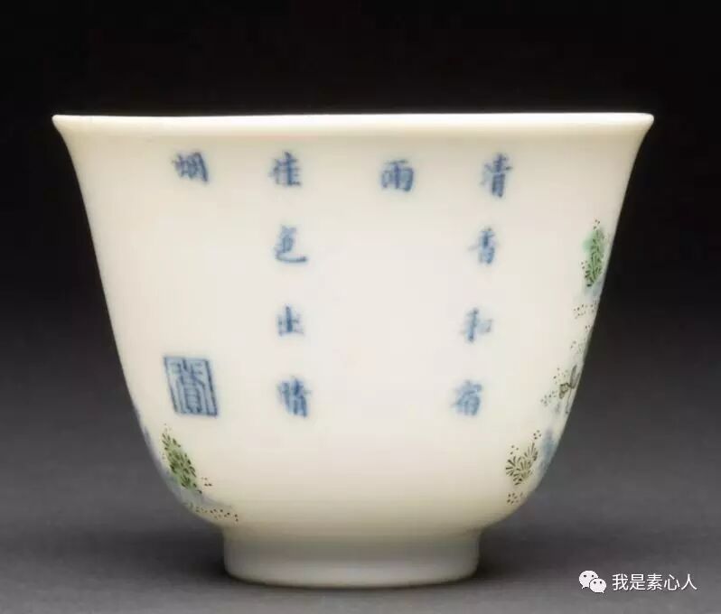 杏花杯,用青花和绿彩渲染出了朦胧氛围,与红色怒放的花瓣形成对比,反面书写
