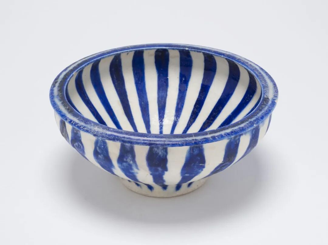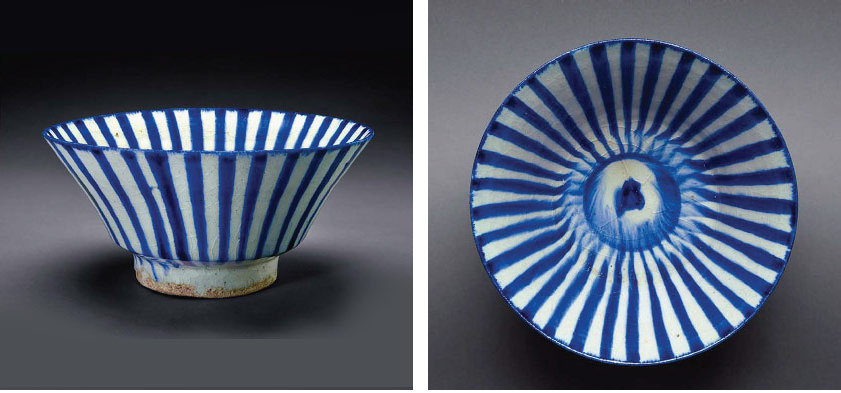 早在宋元时期的伊斯兰地区(当今伊朗),当地陶工受宋代瓷器造型影响,而设计了高足敞口碗,但配上了当地的钴料,绘上几何条纹,从碗中心散射出去,韵律感很强。
