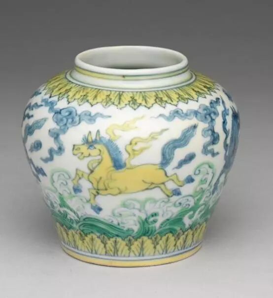 还有小飞马罐,绘有四匹马,一红,一黄,两青。海水汹涌,浪花飞溅,马儿大展双翅,英姿飒爽。