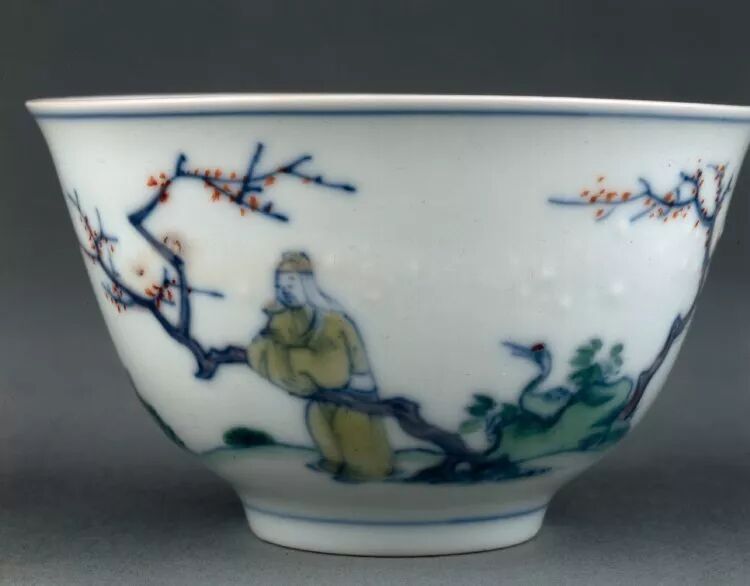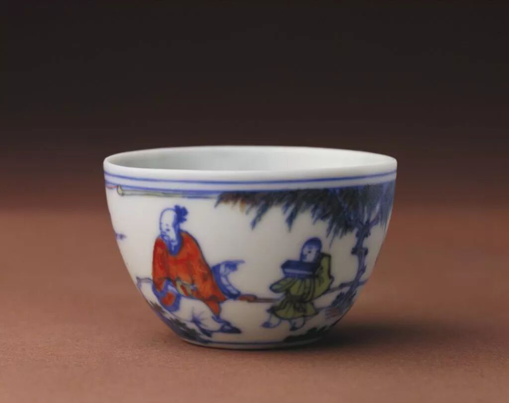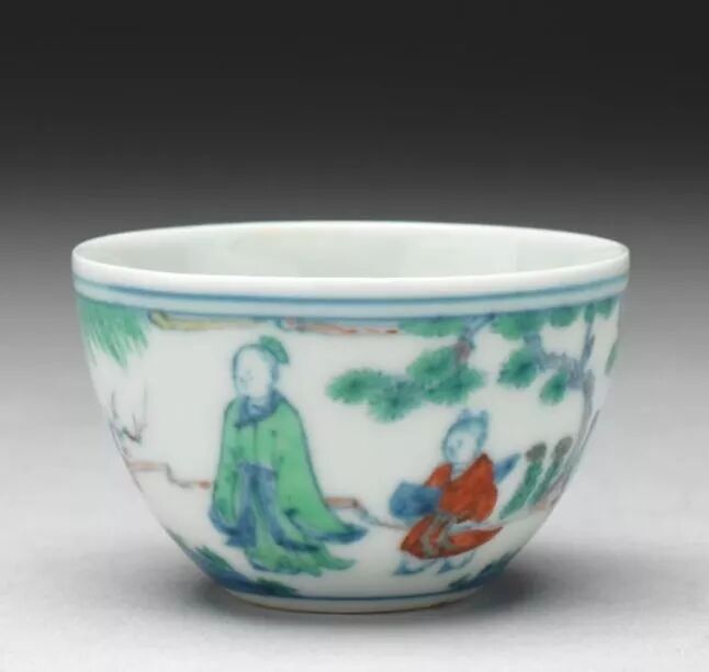 成化斗彩小杯里,我最喜欢的就是各类高士主题的杯碟,陶渊明爱菊+周敦颐爱莲,俞伯牙携琴访友+王羲之爱鹅等等。小杯大意境,天上的淡黄月晕,路途中青松绿柏,身后稚嫩红衣小童,画面柔和静谧,幽婉深邃,像是看马远的画,小小一角,却天浩地阔。成化超级大粉雍正也极力模仿成化风格, 其斗彩高士杯也是很有味道了。