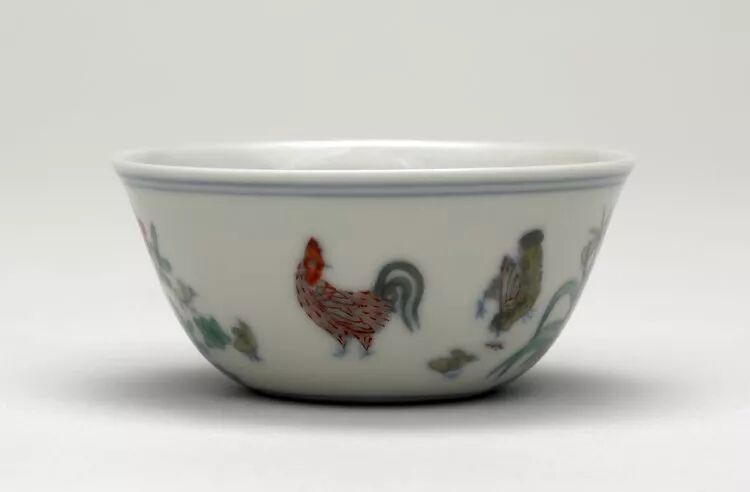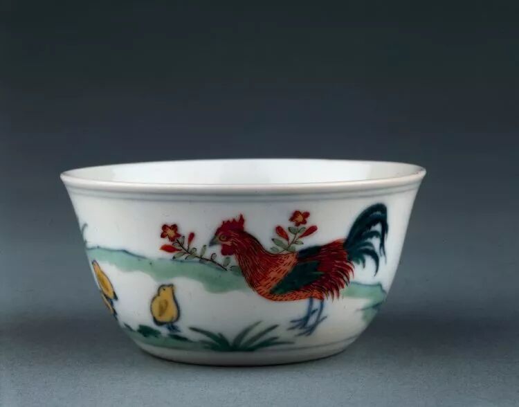鸡缸杯本身的制作精细才是备受推崇的最主要的原因。如果你仔细看,杯子胎体很薄,而且圈足修饰的极为规整,几乎看不出痕迹。画面上的雄鸡,母鸡,小鸡等等也是当时很新奇的创新设计,加上成化时期的各类釉彩颜色,所以整体画面生动,活灵活现。这不是件容易的事,画的惟妙惟肖不难,但能体现画面感就很难了,乾隆时期仿制的鸡缸杯,整只鸡占了画面的一半,完全没有灵动的氛围,小鸡还蛮可爱的,但那只大公鸡与杯子的比例极不协调。