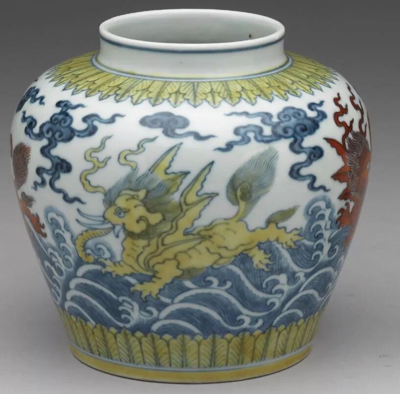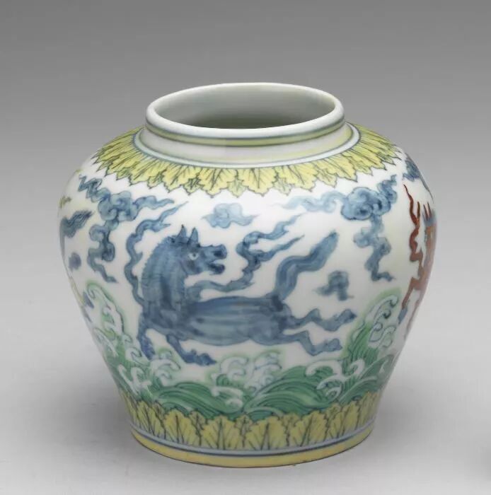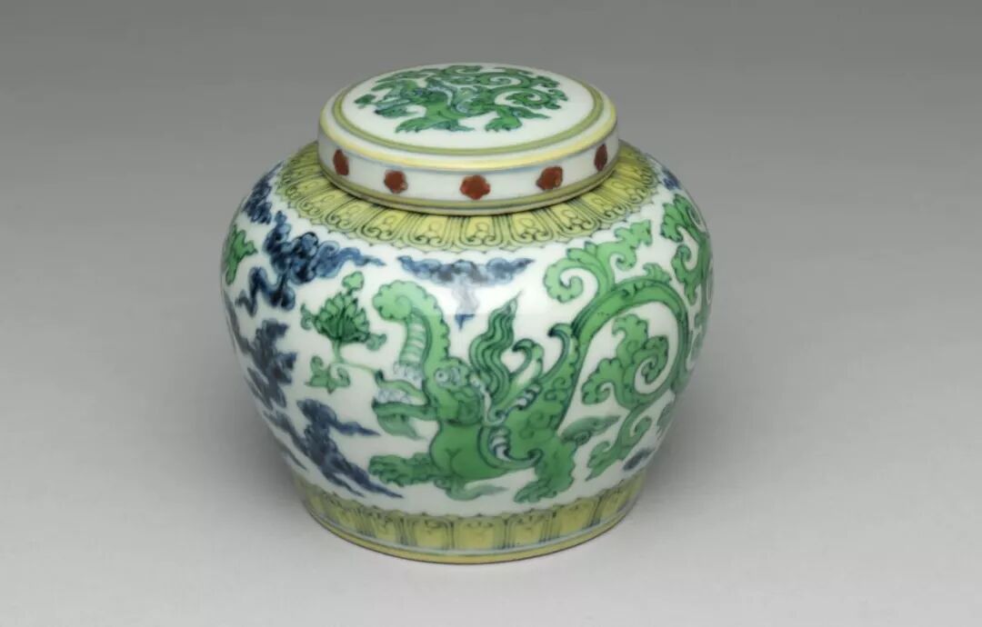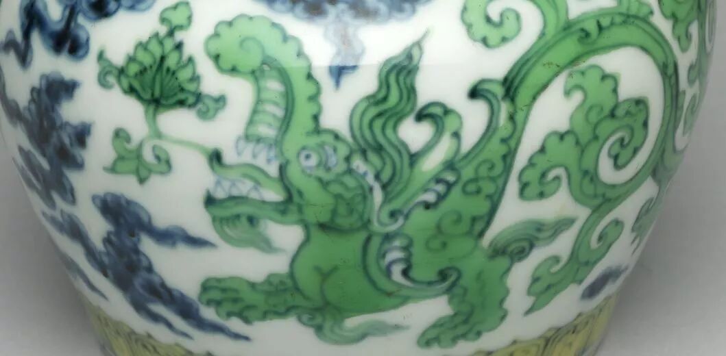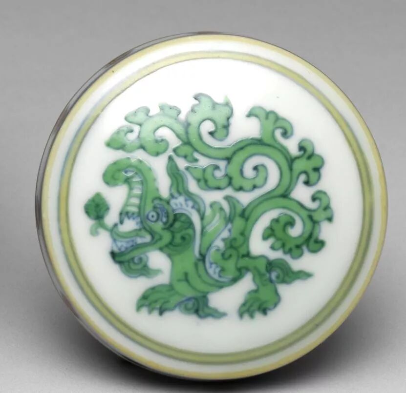 成化的龙,也不是张牙舞爪,而是在天地间漫步轻舞。 淡淡的青花线条轮廓内用清丽的绿釉填满,龙颈高昂,张嘴舌吐莲花,龙身呈波浪状,龙尾翘天,脚踩如意祥云,绘在仅高11.3厘米的短颈宽肩的小罐子上,不见猛兽的凶猛,倒见灵兽的活泼可爱。