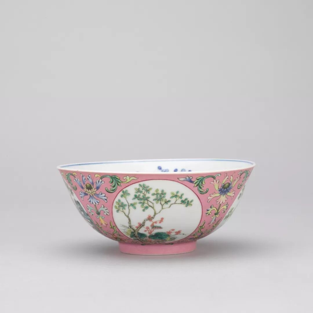 乾隆粉红地粉彩开光花卉碗,故宫藏品。