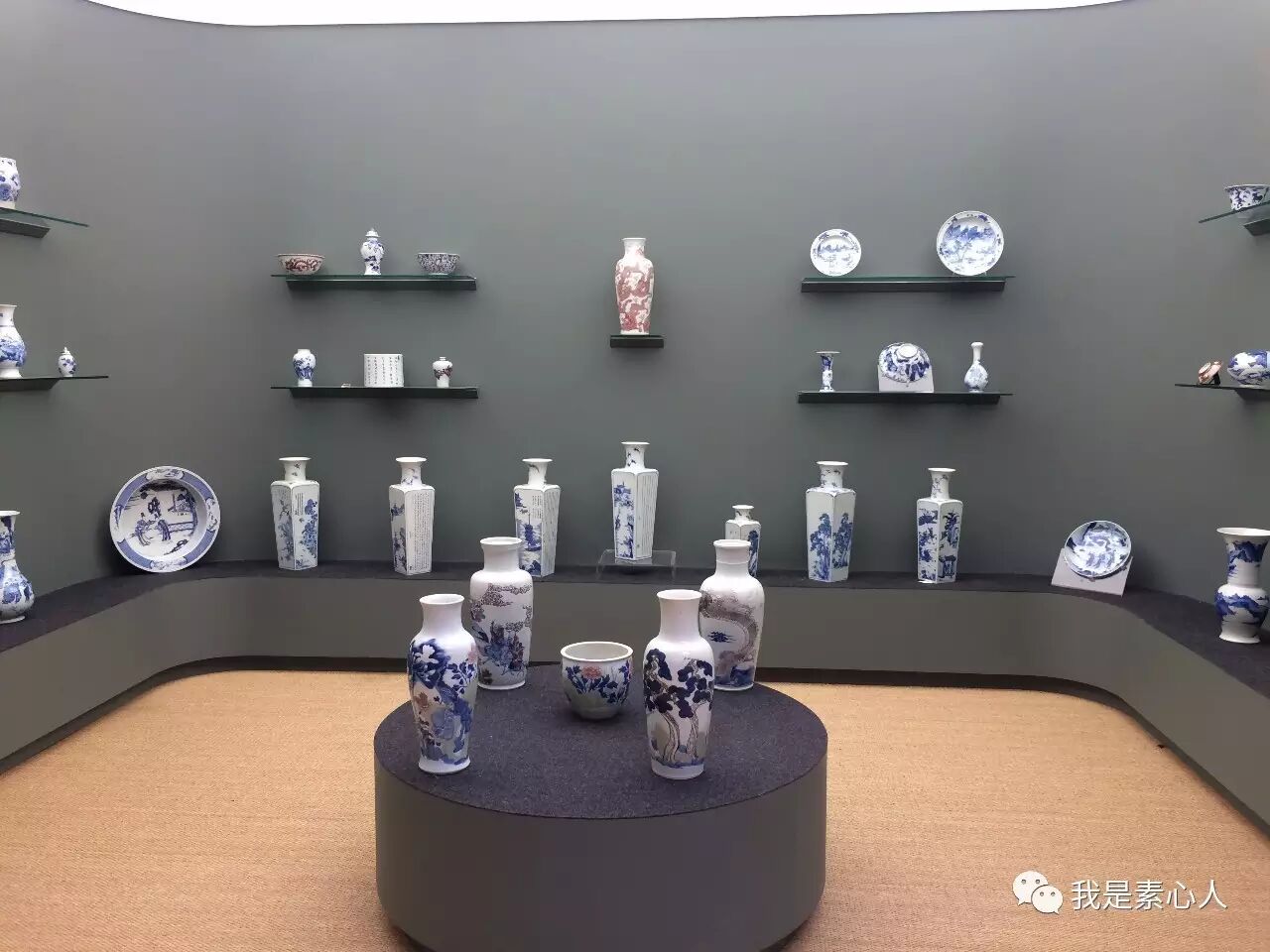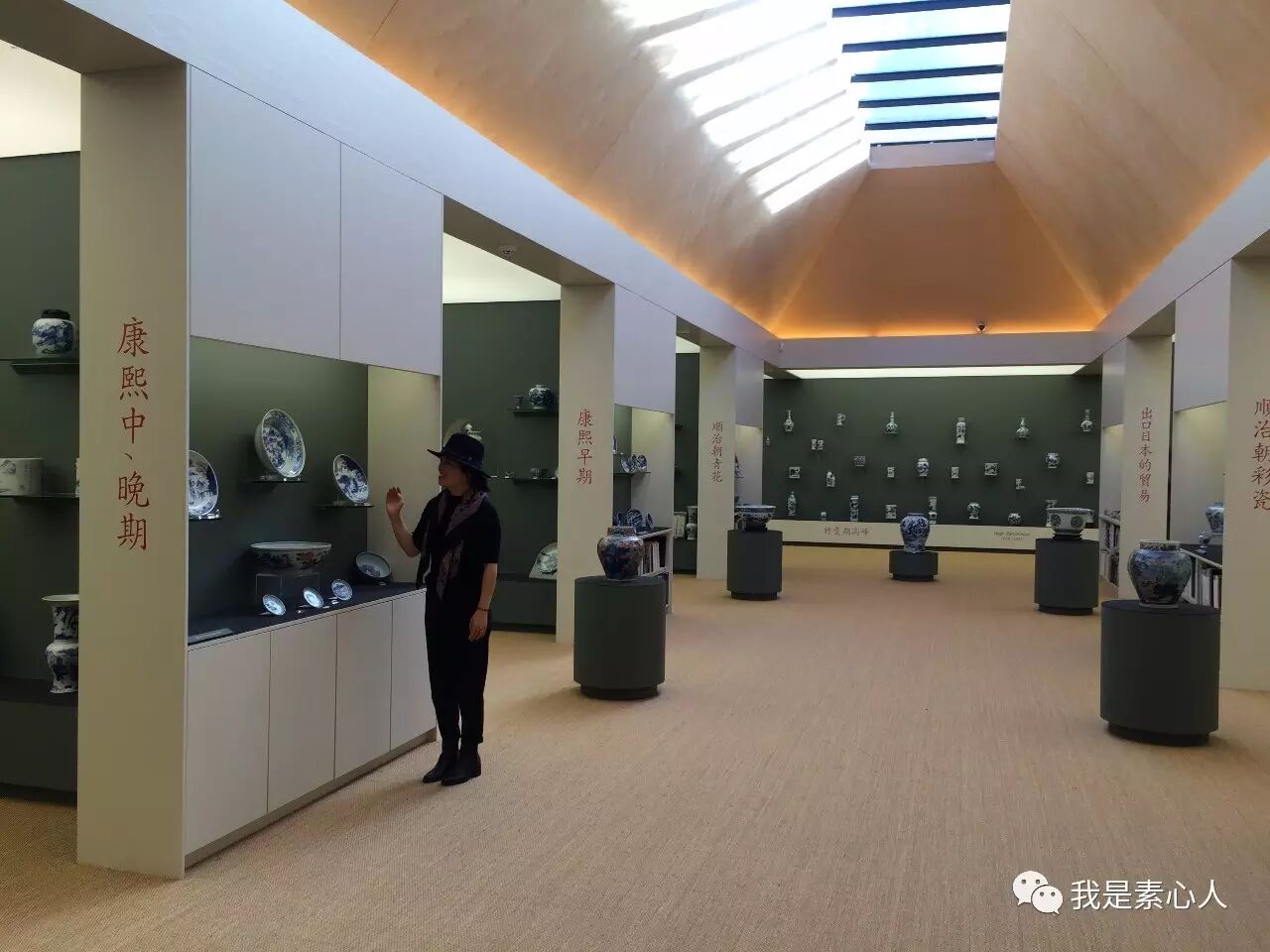 左转进入展厅,那天的阳光透过天窗洒进来,Katherine说父亲喜欢在自然光下看瓷器,所以除了背景墙之外的灯光,展厅并未设有陈列灯光。天窗透出来的阳光把空间照的透亮,展览布置的清新淡雅,白墙上红色字体标出各个时期,灰青色背景墙上摆放着瓷器,展厅中间通透,两边隔出各个区间,按时代区分瓷器,不得不说,这是我见过最美的收藏和陈列。