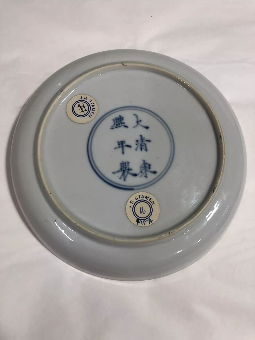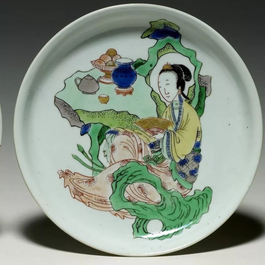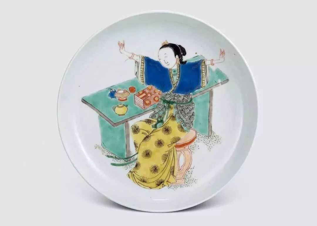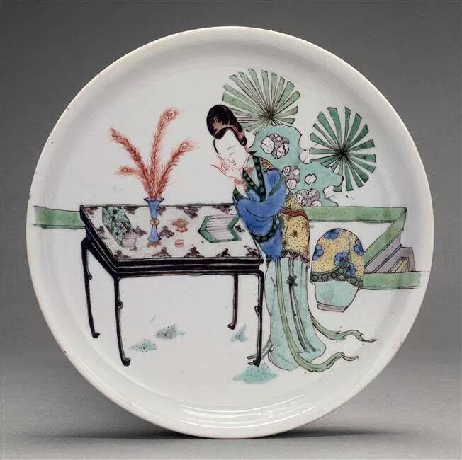 关于大头女的瓷器,我已经写了不知道几篇了,康熙瓷器上的美人我也已经用光所有词汇。(详情请戳:康 熙 瓷 器 上 的 美 人& 康熙瓷器上的美人)但是这一款还没有专门写过,就是盘子直壁但口沿微微外敞,尺寸不是很大,大约都在15-20厘米左右,中心都绘有单个仕女,或化妆,或头疼,或小憩。大英博物馆和吉美都有收藏。洁蕊堂这件比较特别的是有‘大清康熙年制’款。