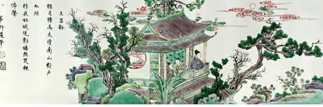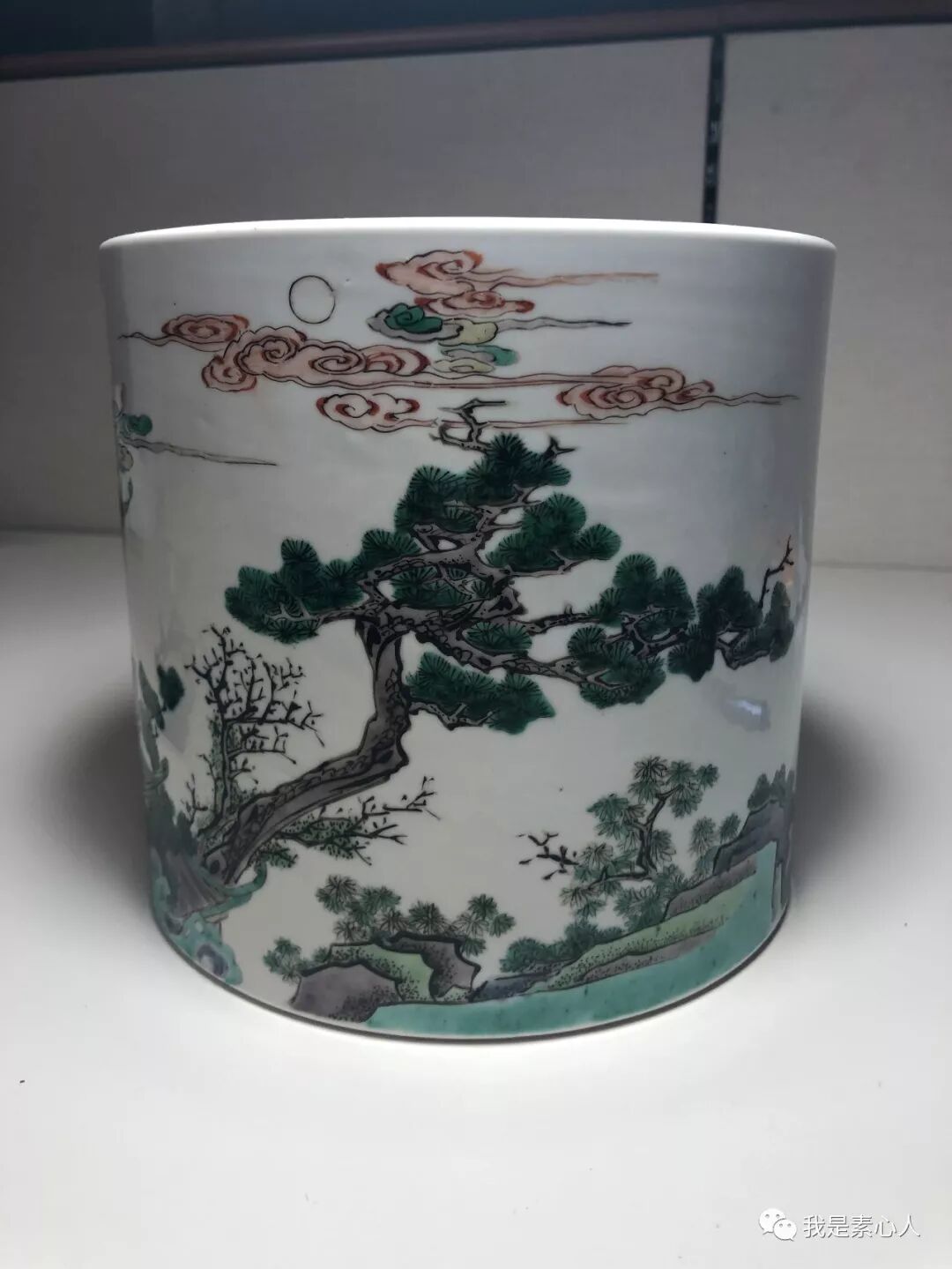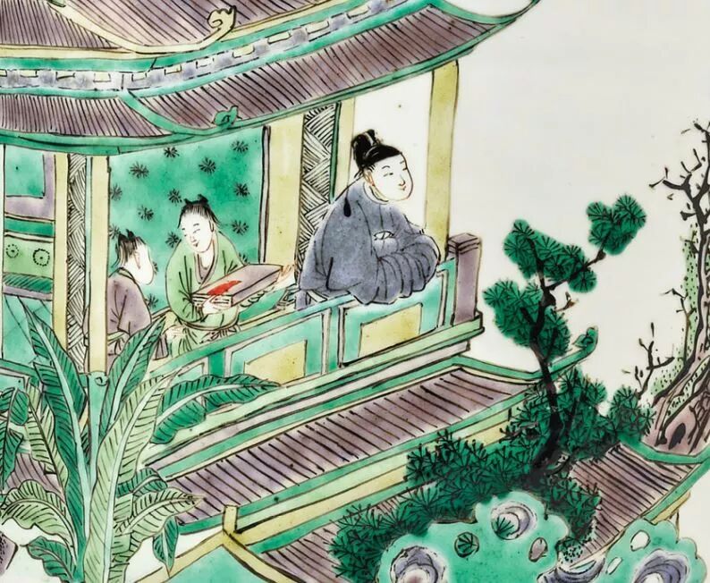这件笔筒,倪亦斌博士做过了详细研究,技术和题字落款等等。而我则是被这件笔筒的整个构图打动,洪大的夜里,上帝视角,从上稍往下俯瞰,天空部分的留白和楼阁周围浓密树丛相对应,构建出了一个清净的闷骚男的夜晚。 月明星稀,旁边的仆人的会心微笑,整个氛围不是孤独寂寞冷的,反而是有种莫名的暖。上帝视角的构图倒像是暗示,上面也有人在看他。虽然整幅图是绿色为主的,但是却弥漫着浪漫的粉红色泡泡。绝佳的情人礼物,你看到月亮的时候,就是看到我。而我第一次在大头女瓷器和画着男人的瓷器中,选择了这个粉红闷骚男笔筒。