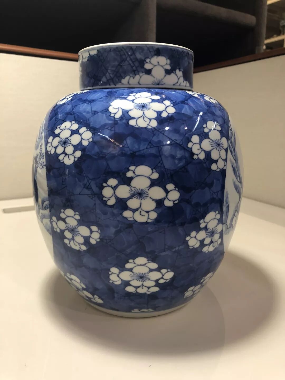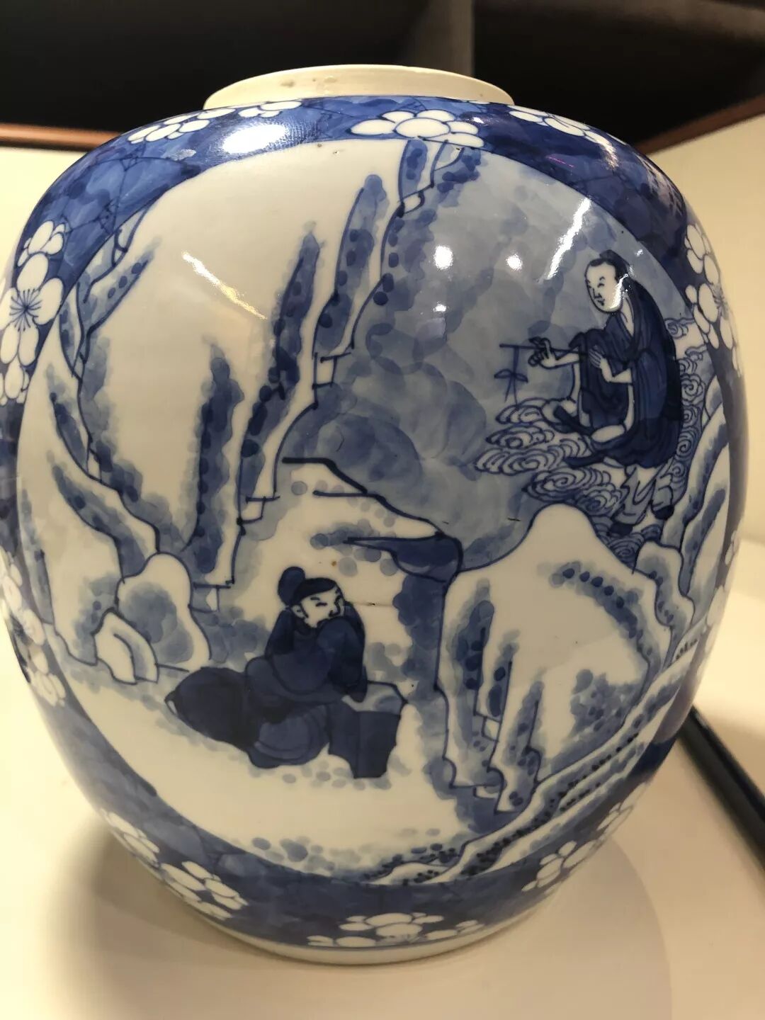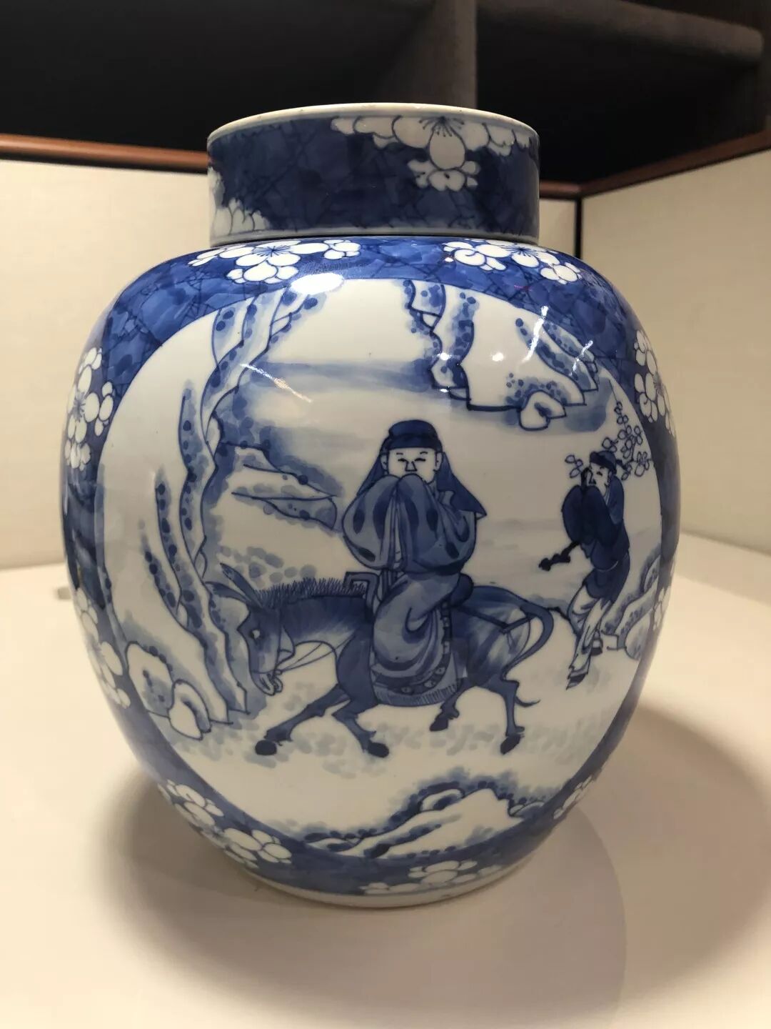难得的是,整个罐子铺满了冰雪梅,深深地扣住了主题,人物衣褶和天地用浓重的青花涂满,而山和梅花用浅色稍稍晕染,烘托出了寒冷的氛围,但是整个罐身的梅花和小童肩膀上的梅花,又暗示着浩然兄正在归途,即使很冷,却不为他担心,毕竟等待他的必是暖烘烘的茅屋和一壶热热的茶(酒)。