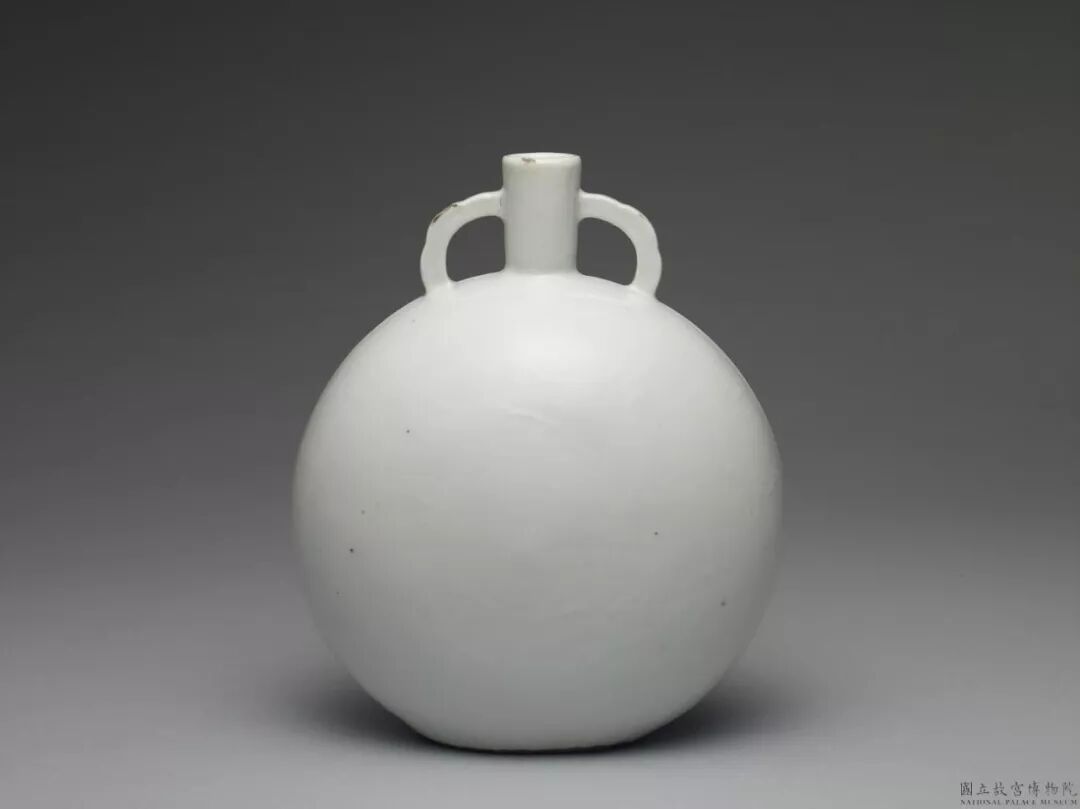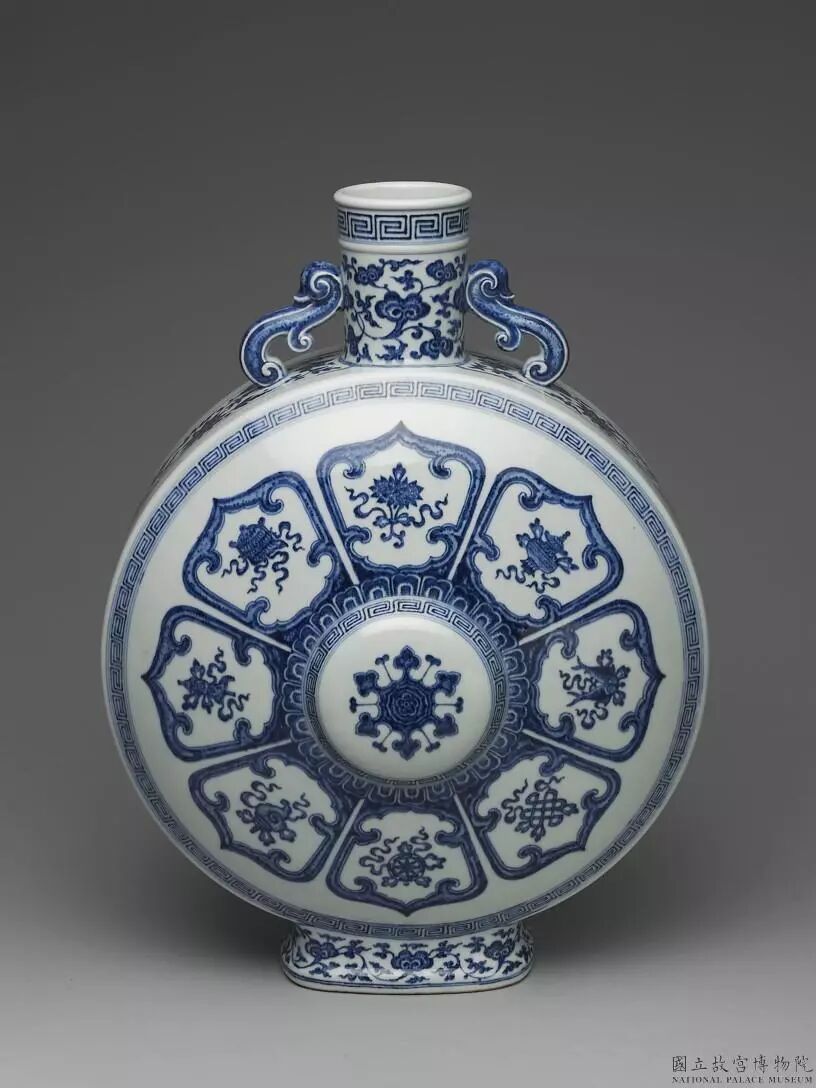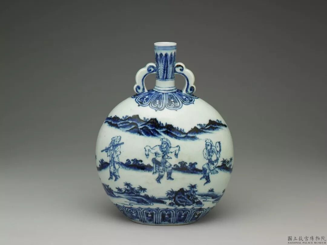 到明永乐时期,景德镇御窑烧造之时,与中东地区的频繁贸易交流,扁壶器型已大有改变,加上瓷器制作的精益,器型更丰富起来,有双耳绶带扁壶,天球瓶,同时也发展出了圆鼓鼓的抱月瓶扁壶。
