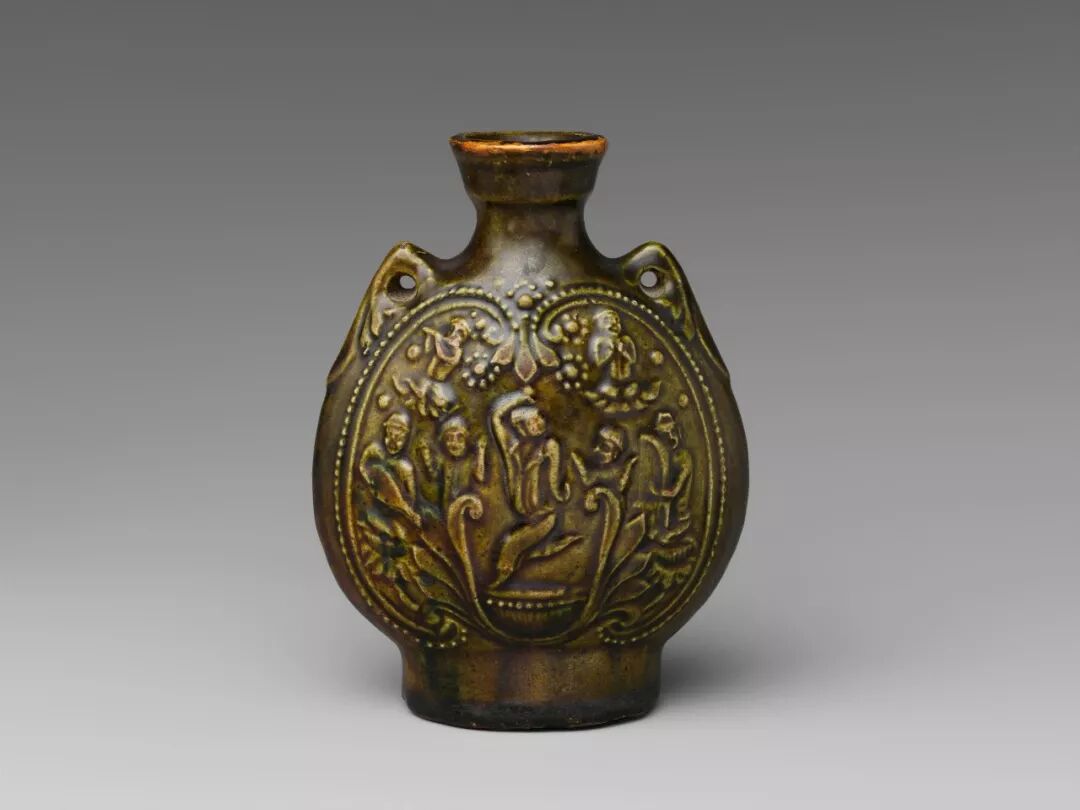北朝铅褐釉印花人物纹扁瓶,故宫博物院藏,描绘胡人歌舞情景。