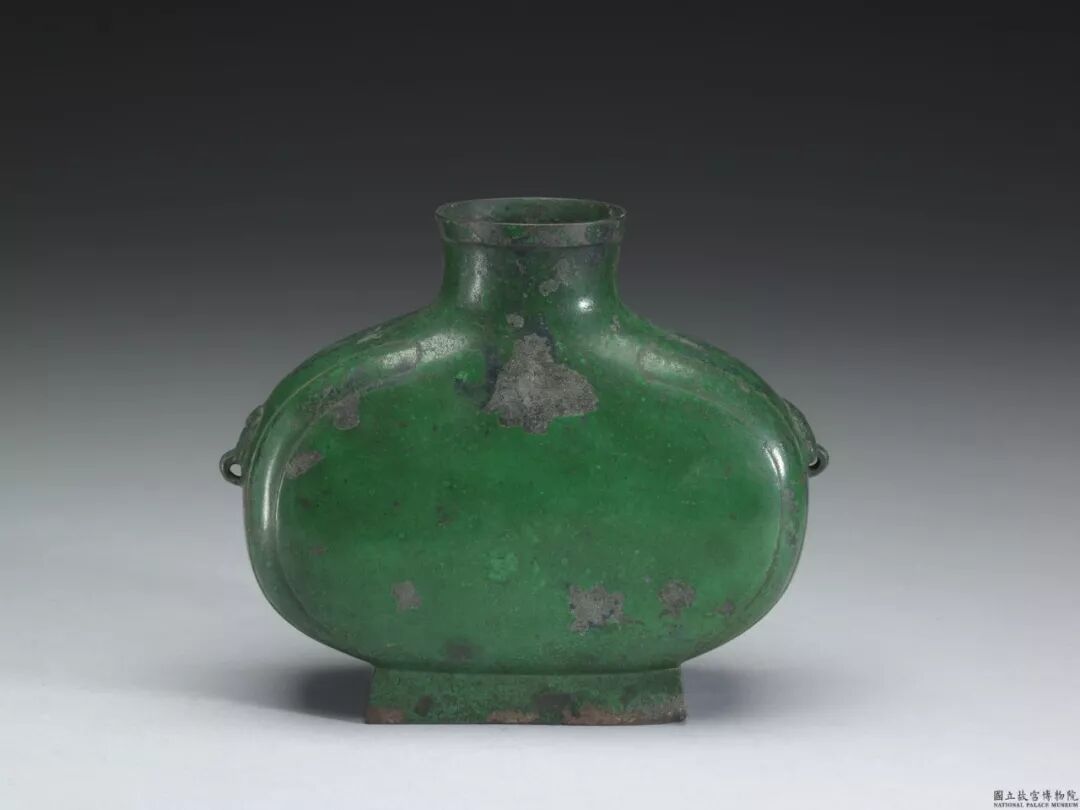 这件器物,实为秦汉时期,铜兽耳扁壶,现藏于台北国立故宫博物院。