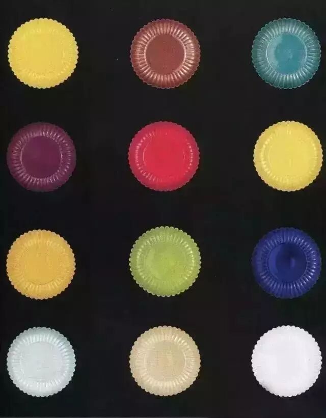 回来做研究,发现张还是蛮喜欢孔雀蓝色调的,她出版的第一本书的封面设计,她就选了孔雀蓝作为封面底色,出了署名书名,没有任何其他装点图案。她自己说,‘我第一本书出版,自己设计的封面就是整个一色的孔雀蓝,没有图案,只印上黑字。不留半点空白,浓稠得使人窒息’(图9)。很显然,张口中的孔雀蓝并非宣德高足碗上的色调,而是更为厚重沉稳的暗色,类似雍正时候烧造的孔雀蓝(图10,右上角,图11左上角)。她的这个孔雀蓝搭配上枣红,的确是如她所说,‘触目异常’,但也同时惊艳,胡兰成在《今生今世》中,回忆起她,‘常时以为很懂得了什么叫惊艳,遇到真事,却艳亦不是那艳法,惊亦不是那惊法。’