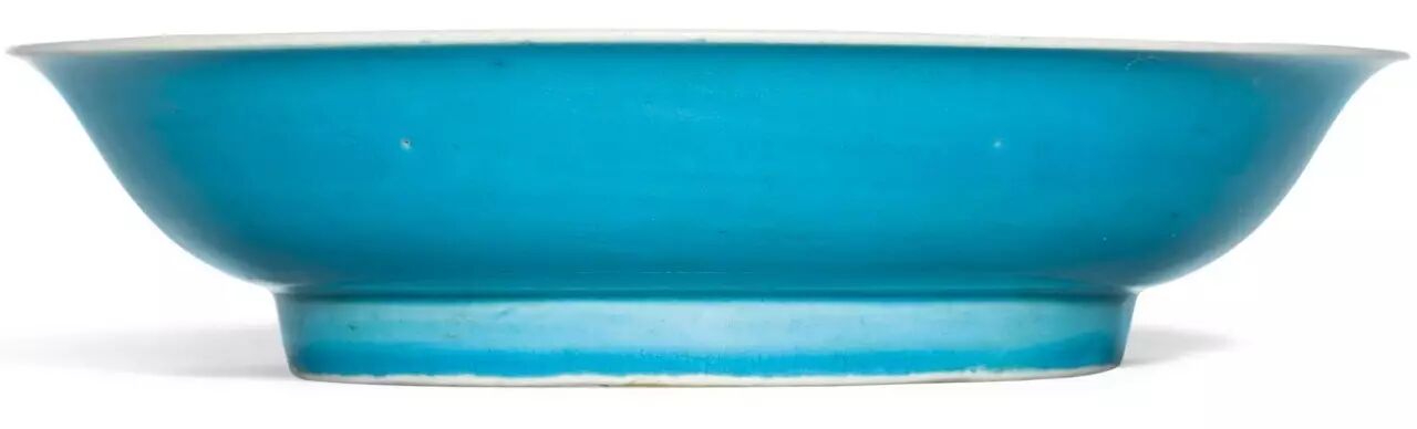 明代的可圈可点的烧造孔雀蓝的时代就那么几个,生产量不多,存世量也少。去年苏富比琵金頓专场中,有一件宣德孔雀蓝盘子(图2),据Regina (康蕊君)考证,类似宣德孔雀蓝釉盘存世有7件,台北故宫3件,大英博物馆1件,大维徳基金会1件,另外2件流通于市场。直到清代康熙时期,孔雀蓝釉瓷器的生产到达了顶峰,各类仿青铜器造型,有的浓重,有的色淡,施釉均匀,发色翠蓝的颜色,真真能在炎炎夏日带你到海边的魔力。