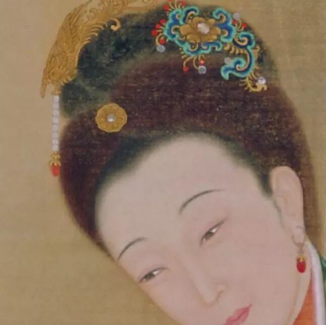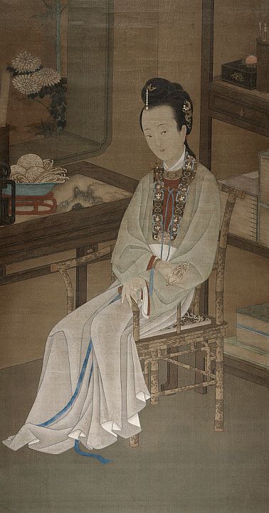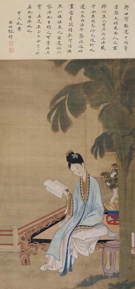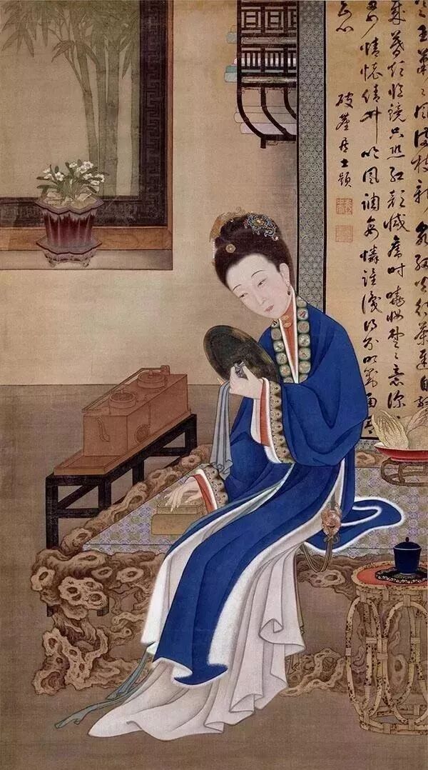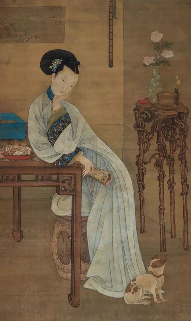 画中女子身着长裙,自然地对着画家。画家当然是高明的,他利用一个狭小的夹角就创造出整个书房的空间感。这名女子身穿天蓝长裙, 头钗石青色的点翠发饰,左手托着下巴,手指还轻轻靠着嘴角,若有所思。很多学者讨论过她读的书,《子夜歌》关于晋朝一位子夜的女子表达内心情感的歌曲,对爱人绝望后的情绪抒发。所以很自然的,这个画中女子,当然似乎也是跟晋朝那位女子一样了,传达着“我爱的人怎么还不来,我好悲伤”的解读。