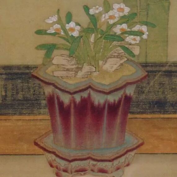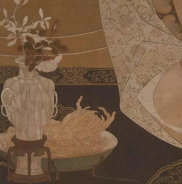 收回正题,书盒前方摆放一盘果物,红釉盘中装载着象征富贵吉祥的佛手柑;奇木上摆放的玫瑰瓶景、舀香小瓶、雕漆制胭脂盒等等,都表明这个女子爱生活的心思和生活品味,一个如此有心境的高雅女子,是不会仅仅拘泥于男欢女爱之中无法自拔的,也许如同《子夜歌》的那位晋朝女子一样,痛哭大唱一曲过后,生活的美是不仅仅依赖于等待某个人,是自发自爱的。