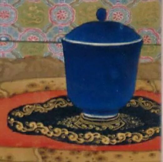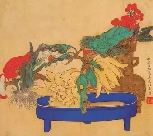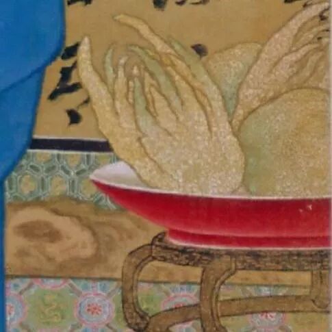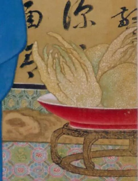 女子头戴‘金丝累凤’,身穿宝蓝对襟裘服,坐于树根榻床之上,身旁摆着竹木茶几。远处的庭院里,竹林娑娑,窗前钧窑花里水仙暗香浮动,无不暗示这是个极致讲究的空间,一花一草都是巧思。而宝蓝色衣服对应的宝蓝茶杯配上黑漆描金缠枝纹盘,诉说着考究。而宣窑红盘里摆着一种稀罕的水果,来自祖国大西北的我,此生都未见过这类水果个,然后就开始了深挖,发现清代很多绘画上尤其是春宫图中都有类似水果个,学名为佛手柑,是清宫诸多工艺品佛手也是名列前茅的设计来源。(图2,图3,图4)