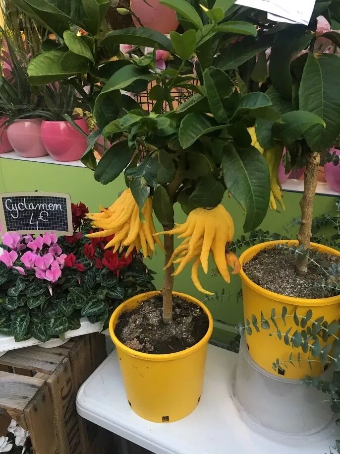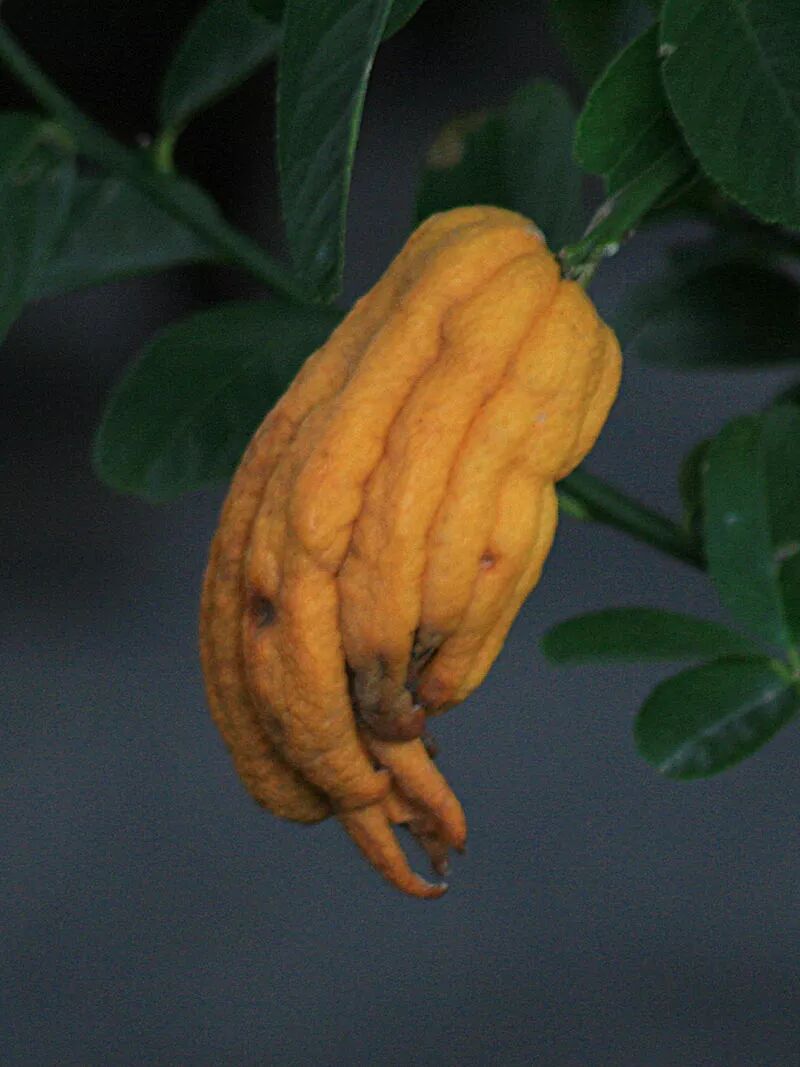 柑果卵形或矩圆形,长10-25厘米,顶端开裂如指状,指抱合如拳或指开张如手,其裂数即代表心皮之数;表面橙黄色,有乳状突起,种子数粒,卵形。花期4-5月,果熟期10-12月。