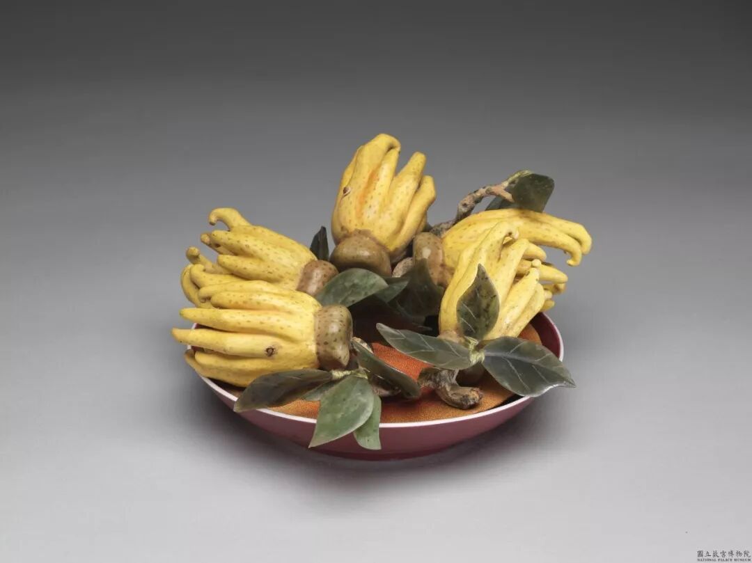 佛手柑本身成为工艺品造型,但为了放香橼、佛手柑,清代还出现了专门的器具,叫香橼盘。台北故宫有一件香橼盘,里面放着栩栩如生的木雕佛手柑,极为可爱。