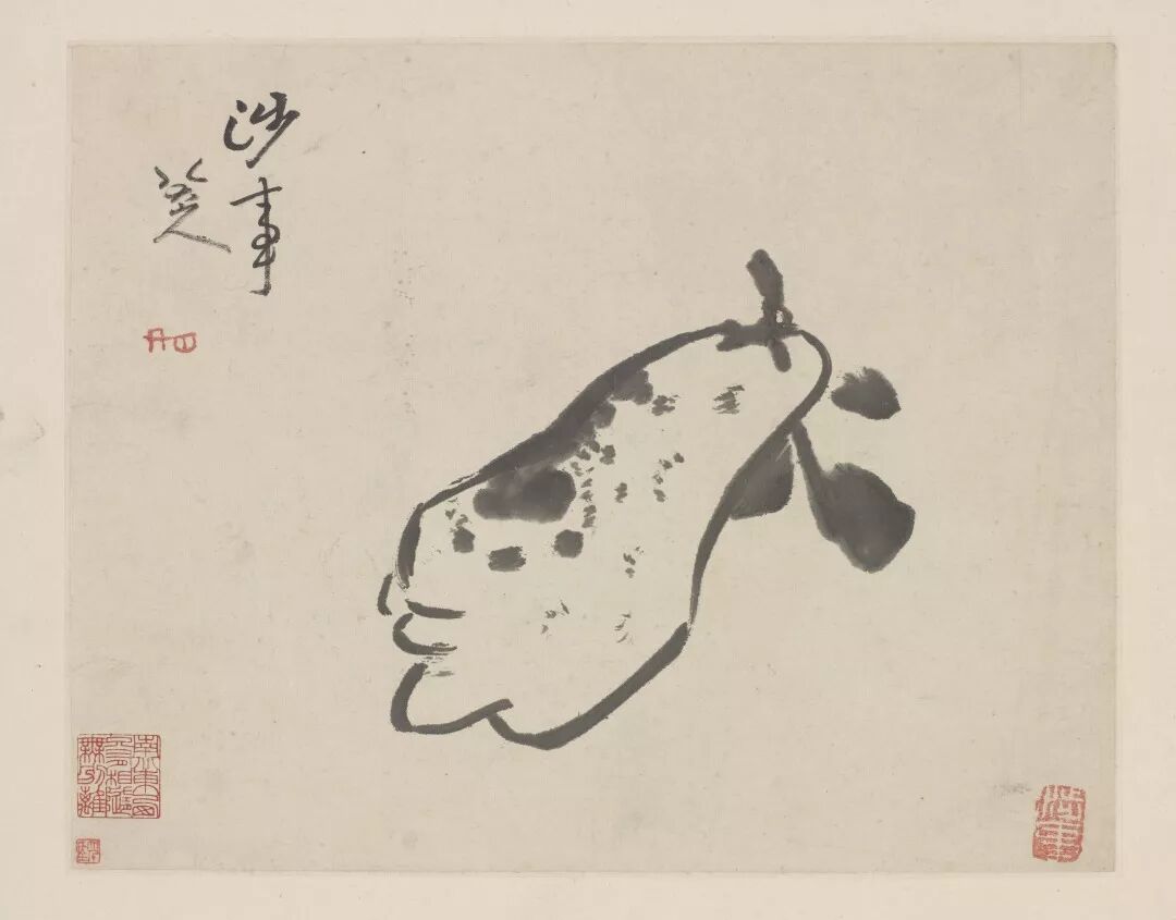 在晚明文人眼中,堆放如山的闻果似乎也是一件俗不可耐的事情,文震亨在其崇祯年间所著的《长物志》器具卷中,特别抨击了几十年前《遵生八笺》所提倡的大盆堆放法:“以大盆置二三十,尤俗。不如觅旧朱雕茶槖,架一头以供清玩;或得旧磁盆长样者,置二头于几案间亦可。”崇尚以少为美,甚至认为摆一头两头就足够了。不过文震亨向来鄙夷市面上流行的作风,由此也可反见当时风气。上文中图7图8陈洪绶和八大山人的画,也就选了一两颗,表明自己与俗不可耐的富人的对立。