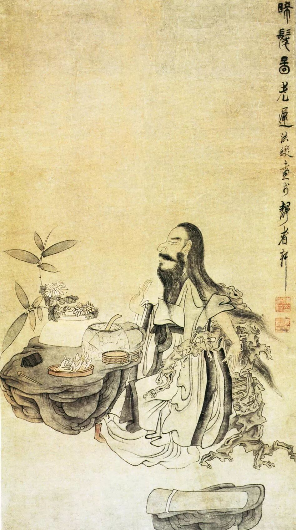 画中骚客,刚刚沐浴,披着一头苍劲有风骨的头发,美酒菊竹相伴,清风徐徐,头发也随之飘逸,伴随着阵阵佛手清香,丝丝缕缕,如入‘六根互用’‘之境。