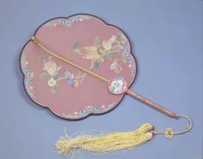 扇呈八葵瓣形,扇骨裹以黄色龟背卐字锦,下连檀木制扇柄,绣折枝佛手、菊花及悄立枝头的一只五色小鸟阴刻竹、桃、灵芝、水仙等四季植物,填涂蓝色,有“灵仙祝寿”的吉祥含义。清代工匠利用各种材质雕成佛手形状,和田玉,象牙,犀角, 玛瑙等名贵材质,随身佩戴或者摆设,寓意福寿富贵。